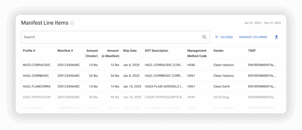 With a snapshot view of manifest line items from every vendor and e-Manifest, you can trust where your waste data is coming from down to the facility-level and across your entire organization.