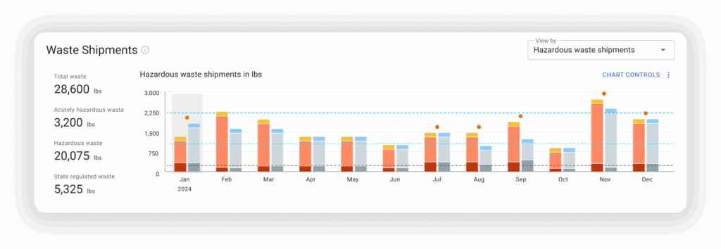 Quickly understand where each facility stands with federal and state generator status thresholds now visible on the monthly hazardous waste shipments graph. No more guessing — just clear indicators of whether you’re near or over the threshold limit.