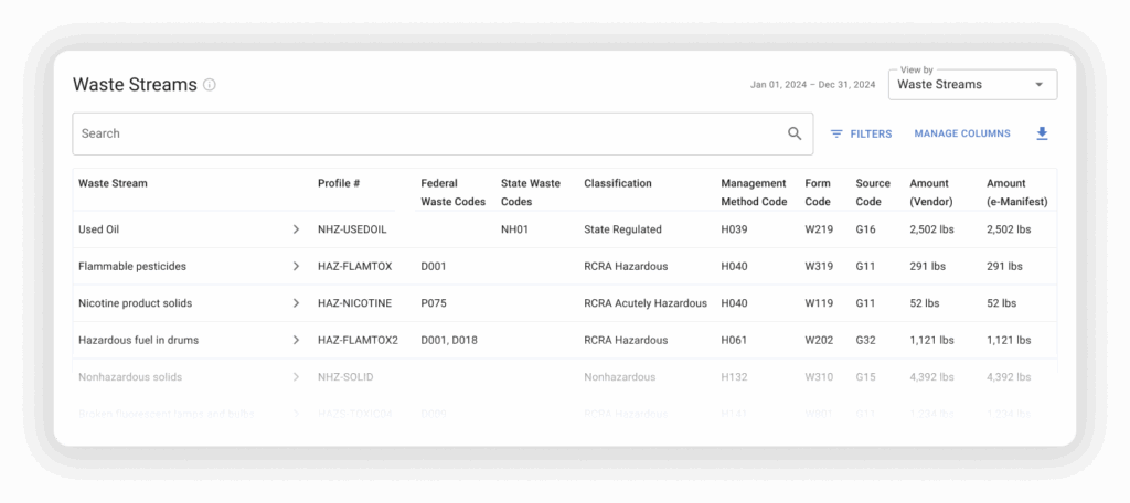 A new, date-filtered Waste Stream table organizes the information you need for waste reporting and notifications, reducing manifest exports and offline manipulation in Excel.