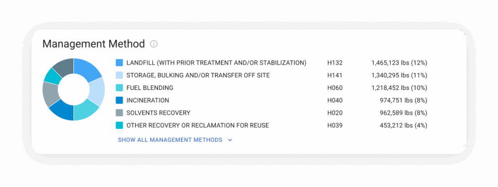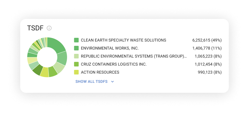 Whether you want to avoid incineration, reduce landfill use, or increase recovery, the Overview Dashboard shows how your business’ hazardous waste is being treated, stored, or disposed of and by which TSDFs.