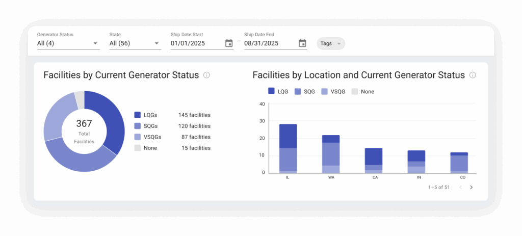 Different generator statuses and state rules mean different obligations — and different headaches. The Overview Dashboard helps you make sense of it all with an at-a-glance breakdown of generator status by jurisdiction. Filter data by facility tag, state, or generator status to drill down to the information you want to focus on.