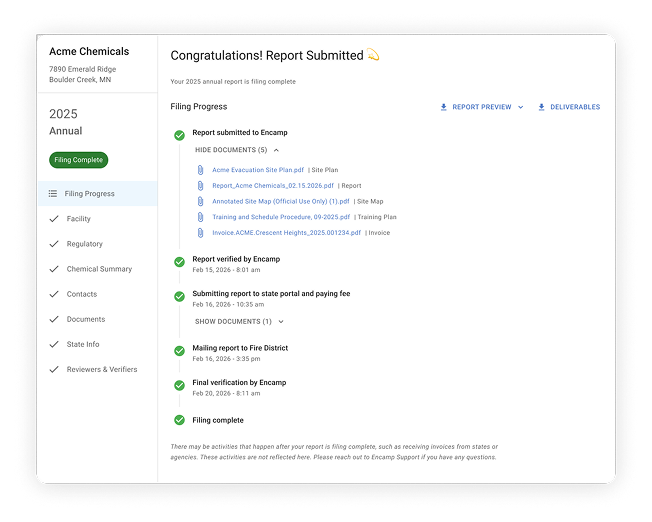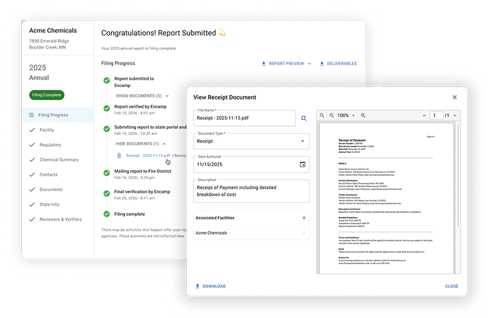 You’ll get a clear view of what was filed, when it was filed, and the filing status of every facility under your responsibility. All documentation is securely stored in Encamp, including previous years’ reports, to keep you audit-ready at all times.