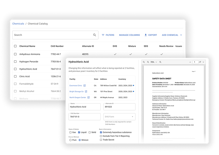 Import chemical documentation (like safety data sheets) and Encamp will create the chemical record for you. Each record includes built-in checks to support accurate reporting. And with one guided workflow for every facility, your team stays on the same page, thresholds stay current, and Tier II reporting becomes more predictable.