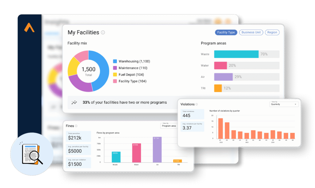 • Track historical compliance performance and fines for each program area, enabling continuous improvement, environmental audits, and environmental risk mitigation strategies.